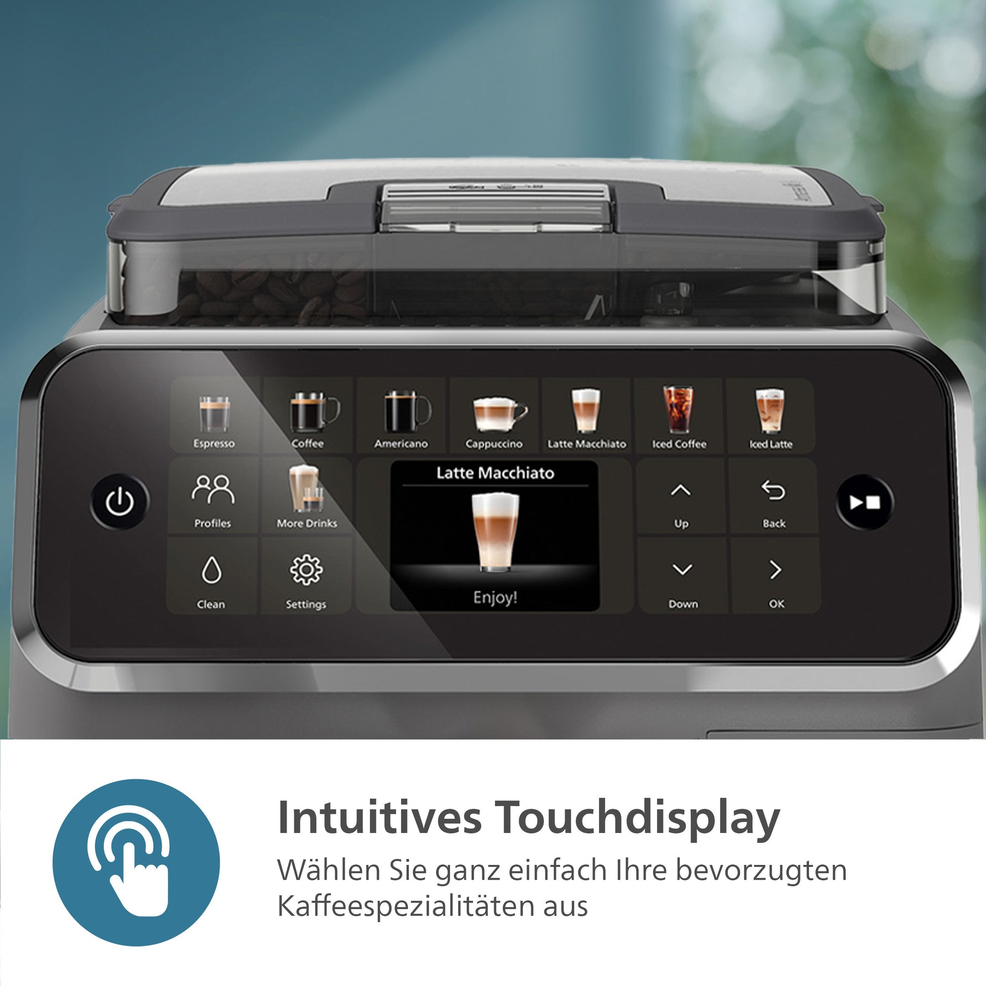 - 20 Kaffeespezialitäten mit 4 Benutzerprofilen: reichen von heißen Getränken wie Espresso, Latte Macchiato und Cappuccino bis hin zu eisgekühlten Kaffees
